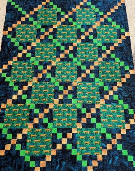 I like to use animal prints in children’s quilts. Panther’s Path resulted from gold panther-print fabric I found on vacation. Lime green and ombré gold squares form a diagonal grid that seems to overlay the panther-print squares.
