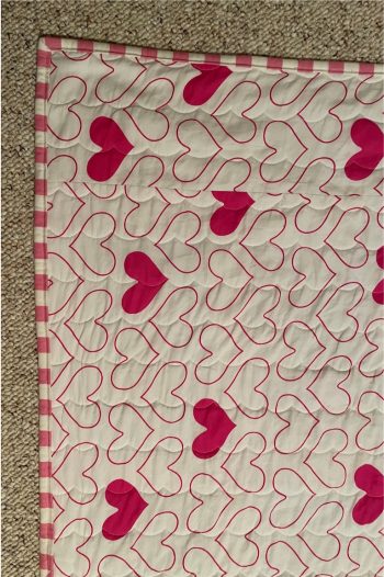 Recently, I used a set of donated blocks from the SafeHouse table to exercise my design skills. The colors were unusual combinations, but I unified them with white sashing and bright pink cornerstones. The finishing touches were a backing fabric (actually a 100% cotton sheet)with white and pink hearts and a binding fabric with pink and white stripes.