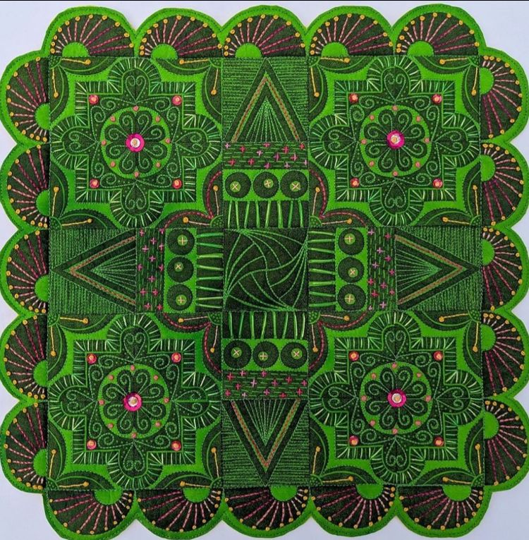 Our January instructor and guest speaker, Mel Beach, has just been awarded the Quilts Japan Award at Quilt Visions 2024 by Noho Vogue of the Japan Handicrafts Instructors at the Visions Museum of Textile Arts in San Diego, CA for her Emerald Gardens (see image below or check this link). This is a layered whole cloth art quilt and free motion quilted. It is painted and block-printed on Evolon fabric with embellishments like hand embroidery and a few sequins for the bling factor.