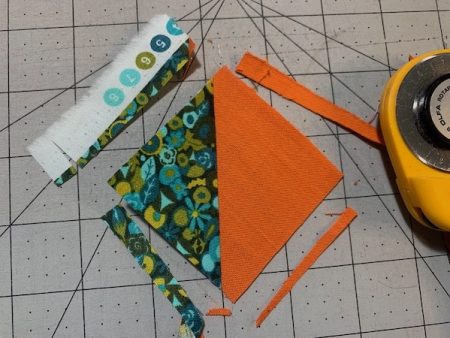Take triangle-ish pieces, sew them together and trim to a 2-1/2’’ strip. Or two approximately 3’’-squares right sides together. You don’t even need to draw a center line, just eyeball it. And you will see how hard it is to go wonky!
