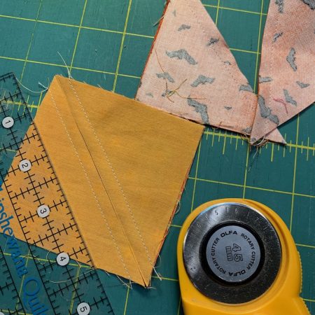 OR: Trim before open. Use the corner of a ruler and align the seam line of your still folded HST with the 2-1/2’’ mark of your ruler, trim, fold open and press. This is the go-to way for many of us.