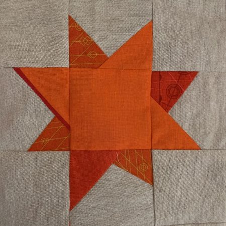 It’s a nine patch: The colorful square is the middle, four solid background squares in all corners, the four middle squares of the outer rows get the eight star tips.