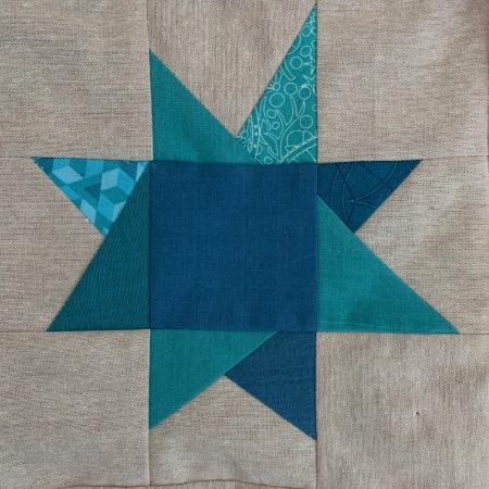 It’s a nine patch: The colorful square is the middle, four solid background squares in all corners, the four middle squares of the outer rows get the eight star tips.