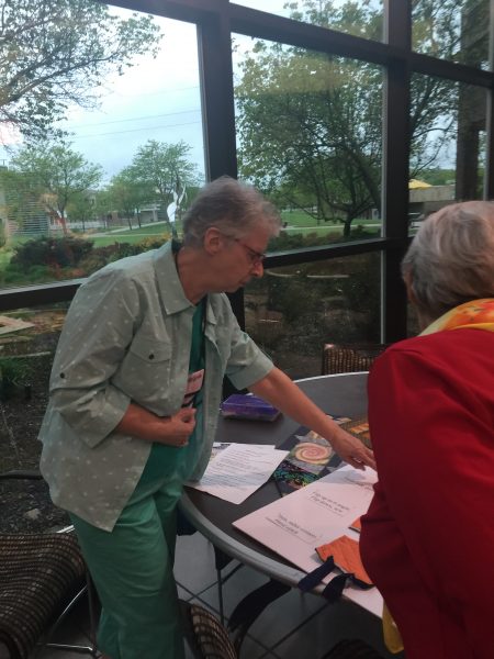 Jan Roys demonstrated two-color binding at GAAQG meeting May 19, 2018 at Morris Lawrence Building, WCC in Ann Arbor, MI